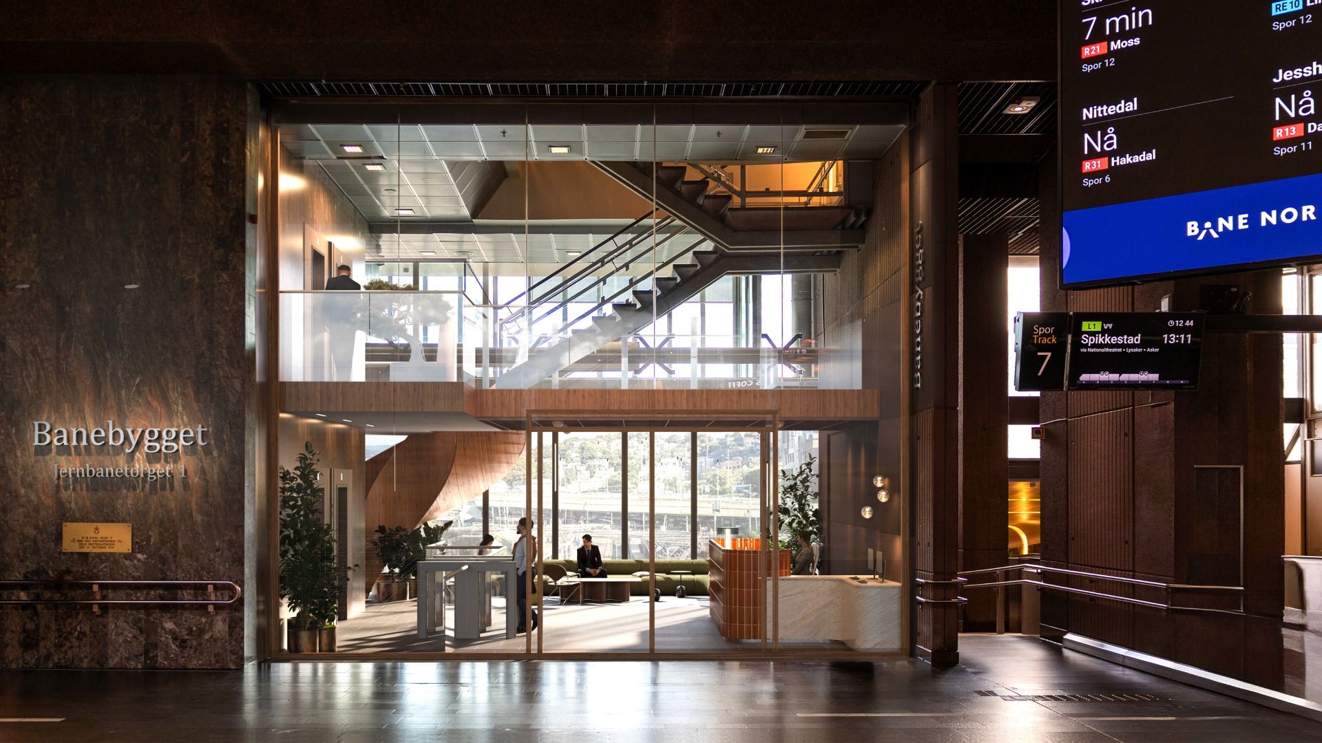 Med kontorer i Banebygget / Jernbanetoget 1, er bil overflødig. Kontorlokalenes hovedinngang befinner seg i avgangshallen, midt mellom nedgangene til de ulike perrongene. Det raskeste og mest hensiktsmessige for de fleste vil derfor være å reise kollektivt. For de som er avhengig av bil, er det godt med parkeringsalternativer i umiddelbar nærhet til lokalene.
